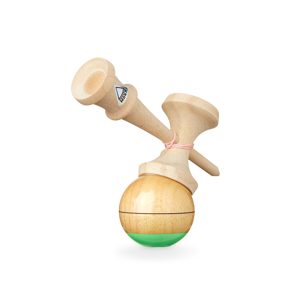 KROM CK shape ken in rubberwood featuring updated KROM triangle sticker and base cup warp hole. 61mm LOL® clear coated rubberwood tama. Pastel green 30% scope, centered wood burn line and pastel pink top tracking dot.