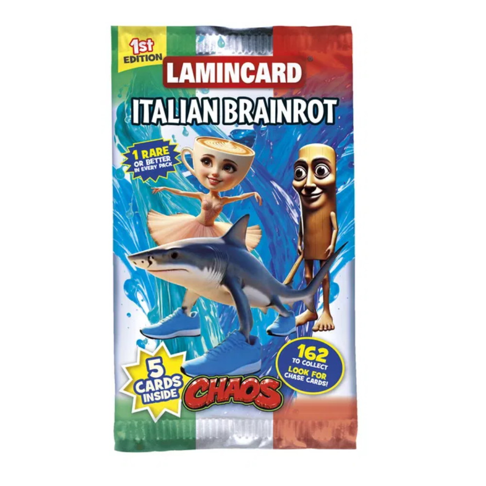 Hyppää suoraan Brainrot-laminakorttien kaoottiseen, hulvattomaan ja täysin järjettömään maailmaan - nyt hurjana italialaisversiona! Ballerina Cappuccinasta Tung Tung Tung Sahuriin, Tralalero Tralalasta Bombardiro Crocodiloon - minkä hullunkurisen suosikin löydät?Jokainen pakkaus sisältää 5 laminaattikorttia:- 4 tavallista korttia, joissa on läpinäkyvä tausta ja hassuimmat Brainrotsit- 1 erikoiskortti, jossa on holografinen tausta ja ikonisimmat hahmot162 erilaista Brainrotia kerättäväksi - 129 tavallista + 33 erikoiskorttiaValmistettu kestävästä muovistaSatunnainen sekoitus jokaisessa pakkauksessa - et koskaan tiedä, mitä saat!Keräsitpä sitten, kävit kauppaa tai vain rakastat popkulttuurin outoutta - tämä on sinulle.Kerää niitä. Vaihda niitä. Hanki niistä pakkomielle. Taistele niiden kanssa.Oletko valmis pelaamaan?Haasta ystäväsi Brainrot-pelissä!- Jokainen pelaaja valitsee 9 satunnaista laminaattikorttia ja asettaa ne 3 riviin.- Valitse haasteesi: TRASH- tai NO-SENSE-pisteet.- Käännä kortit yksi kerrallaan - korkein pistemäärä voittaa kierroksen.- Erikoiskortit vetävät vastustajalta 30 pistettä!- Voita kierrokset, pidä korttisi - hävinneet kortit heitetään pois.- Eniten kuvapuoli ylöspäin olevia kortteja 9 kierroksen jälkeen = voitto!
