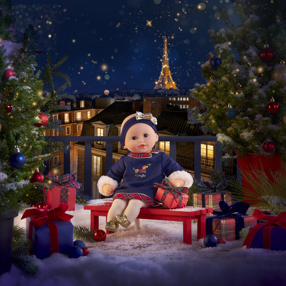 Tämä nukke on puettu loma-aikaan kauniiseen tummansiniseen pitkähihaiseen mekkoon, jota koristavat pehmeät valkoiset tekoturkisreunukset. Ruutukuviot koristavat mekon Peter Pan -kaulusta ja helmaa, ja kultaiset yksityiskohdat piristävät ilmettä. Kimalteleva serigrafia pienestä mäyräkoirasta ruudullisessa takissa lisää suloisen silauksen. Bébé Calin Margaux Corolle en Fêtes -nukke täydentää asunsa kermanvärisillä sukkahousuilla ja kultaisilla ballerinakengillä. Hänen hiuksiaan koristaa yhteensopiva pääpanta, jossa on elegantti kultainen rusetti.