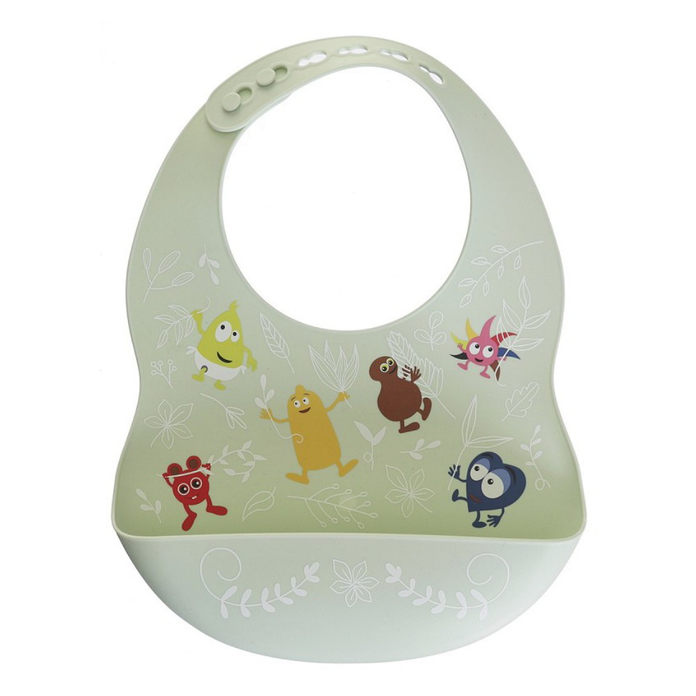 Babblarna-silikoniruokalappu, jossa kaunis kuva kaikista Babblarnista luonnossa.