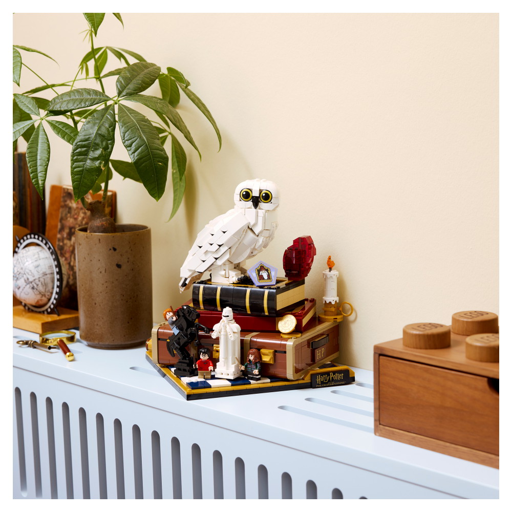 Rakenna siivet supussa istuva LEGO Hedwig tunturipöllöhahmo ja aseta se esille viisasten kiven viereen Harry Potterin kirstun päälle. Lisää sommitelmaan 3 LEGO Harry Potter minihahmoa – Harry Potter, Hermione Granger ja Ron Weasley – sekä suklaasammakkokortti, velhoshakkilauta ja muita esineitä.