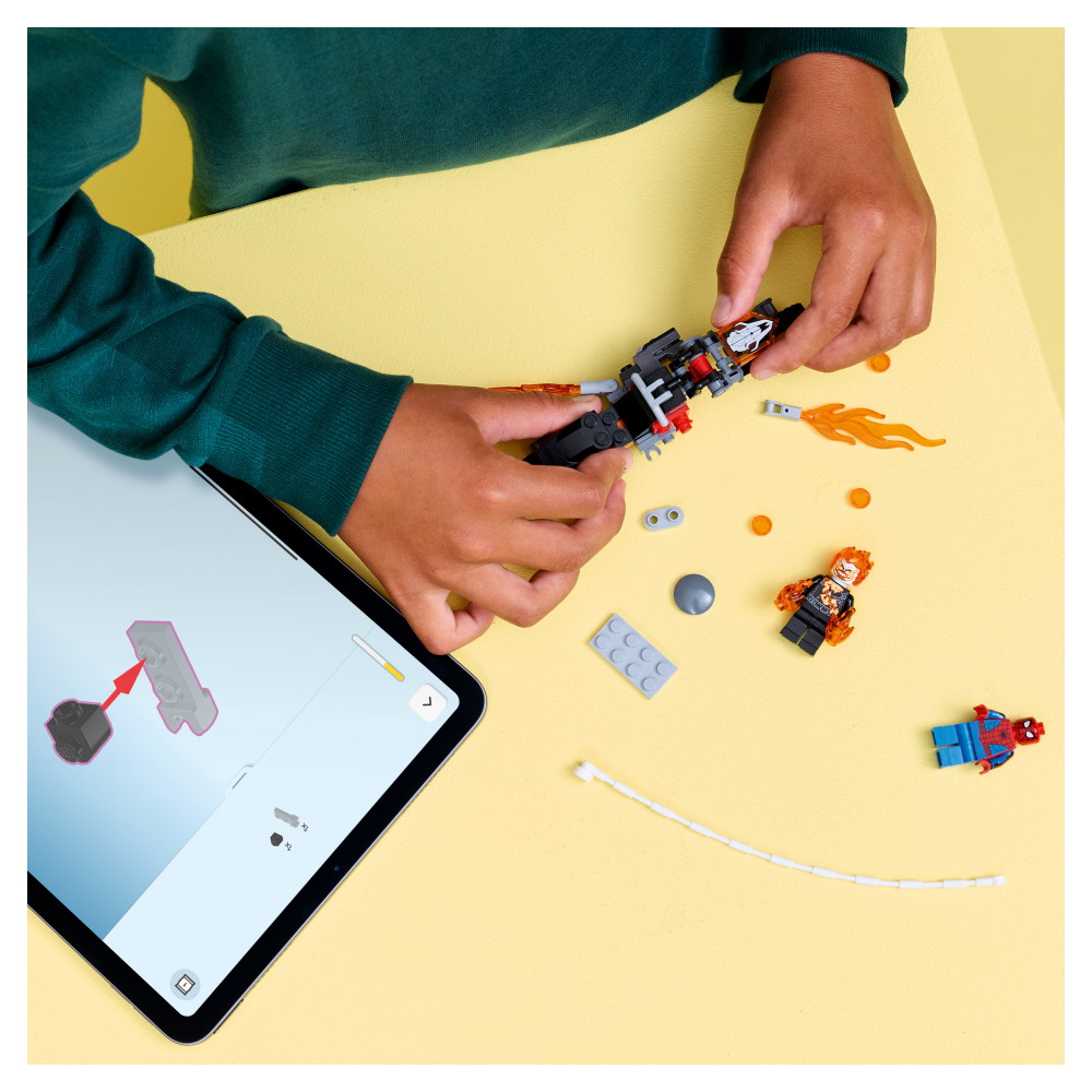 Aaveajajan minihahmo on luuranko, jonka pää ja kädet ovat liekeissä. Legendaarisessa moottoripyörässä on 2 liekehtivää pakoputkea ja 2 sisäänrakennettua nuppipyssyä. Spider-Man-minihahmon seittiköyden voi kiinnittää moottoripyörään. Hahmojen taistelut vauhdikkaan menopelin selässä inspiroivat loputtomiin mielikuvitusleikkeihin. Setti on mainio syntymäpäivälahjaidea pienille supersankareille, LEGO rakentelijoille ja Spider-Man-keräilytuotteiden ystäville. LEGO Builder sovellus selkeine digitaalisine ohjeineen antaa lapsille itsevarmuutta rakentamiseen. Sovelluksessa he voivat zoomata ja kiertää malleja 3D-näkymässä sekä seurata edistymistään. Rakennussetissä on 72 osaa.