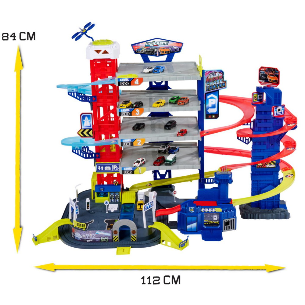 With 6 playable levels, 56 parking spaces and countless functions, this car dealership will be the centerpiece of any toy town - and the garage for your model car collection. The 112x70x84 cm highway offers plenty of space for fast races and creative adventures. Rotating signs, light and sound effects and a sticker sheet add extra excitement to the game. And when things get dangerous? Then the integrated police station comes into play – with 2 police cars, a drone, a trapdoor and a prison, it is equipped for any mission.