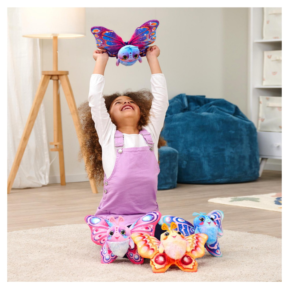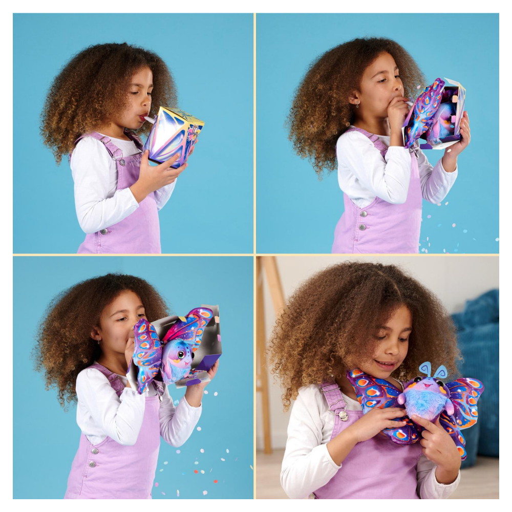 Fluffyfly is more than just a butterfly: It surprises and enchants from the first second! Simply blow up the box with the included straw, and the cute butterfly toy unfolds its colorful wings - along with colorful confetti flying out of the box. With sparkling rainbow eyes and an impressive wingspan of 30 cm, this unique plush toy immediately captivates all children!