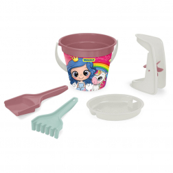 Setti sisältää viisi osaa: lapion, haravan, siivilän, hiekkamyllyn sekä 3,4 litran ämpärin prinsessakuvioilla.