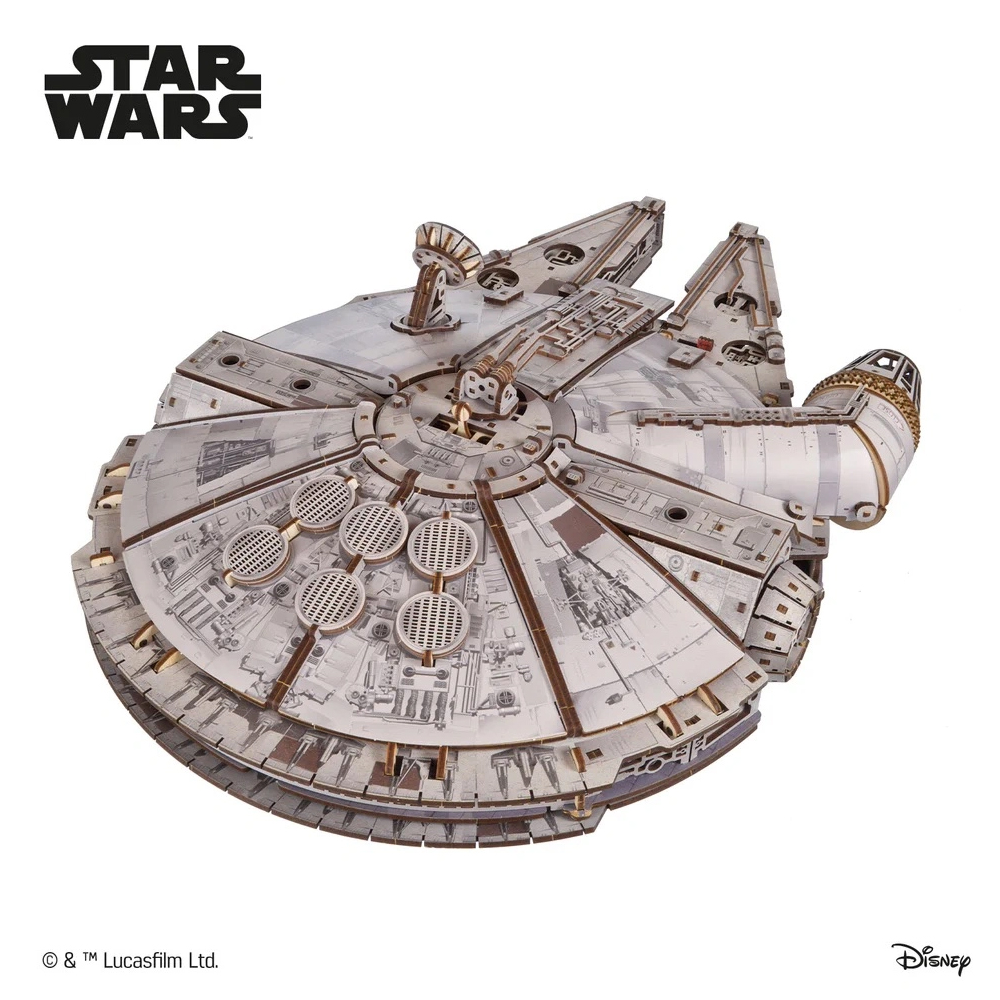 Movable elements include the boarding ramp, cargo bay door, landing gear, gun turrets, rotating 360° antenna, and retractable roof that opens to display the amazing detailed realism of the ship's interior. High density fiberboard and cardboard elements bring added durability and interest. Build and own a piece of cinematic history with this absolute showstopper 3D model of the Millennium Falcon.