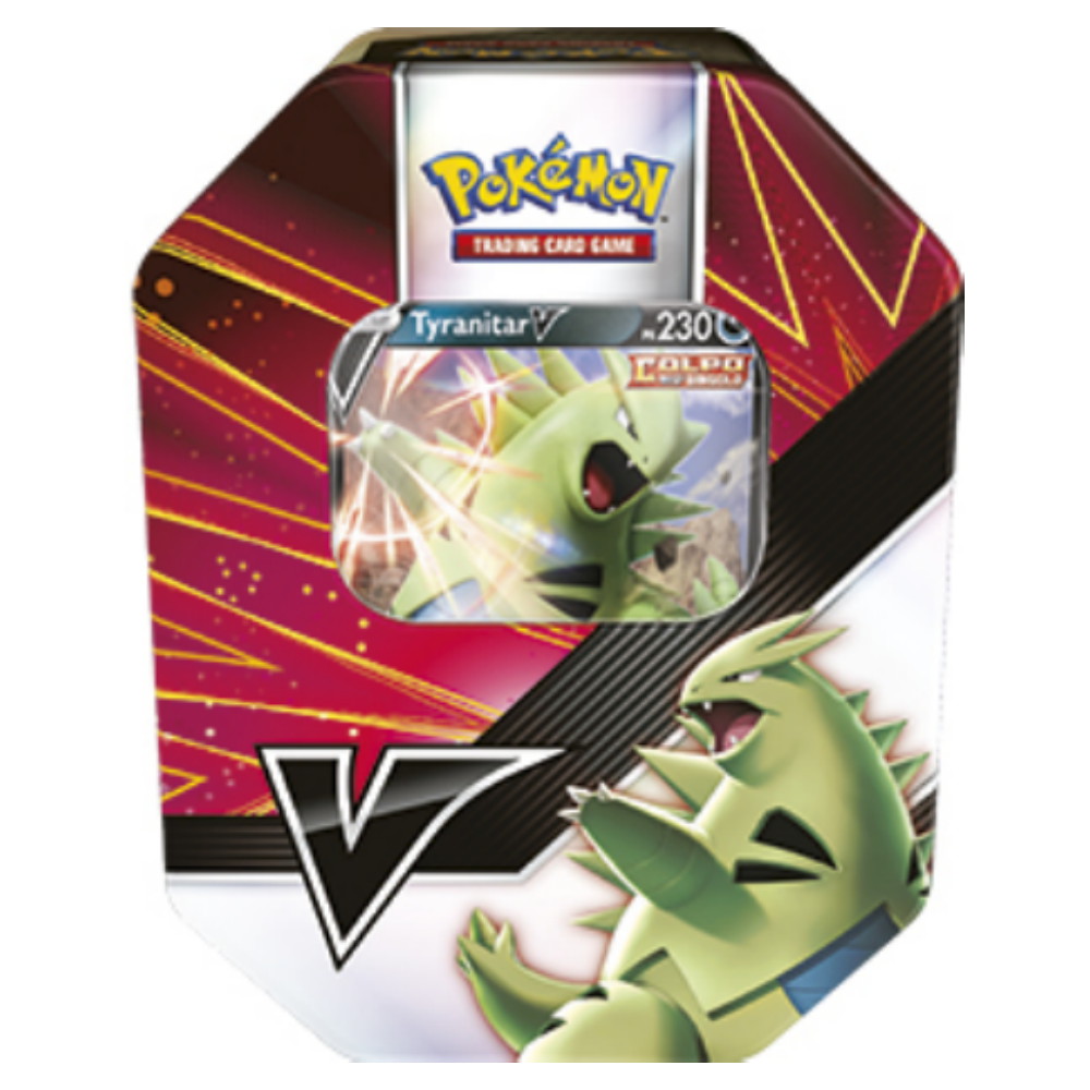 The time of hard-fighting Battle Styles is upon you, with new Pokemon that strike hard and strike often-such as these two monsters of mayhem! Choose the crunching power of Tyranitar V or the quick icy moves of Empoleon V in the Pokemon Trading Card Game: V Strikers Tin. Each of these fantastic tins contains a super-powerful Pokemon V, with the moves, the strength, and the skills to take you to the top in your next Pokemon battle!