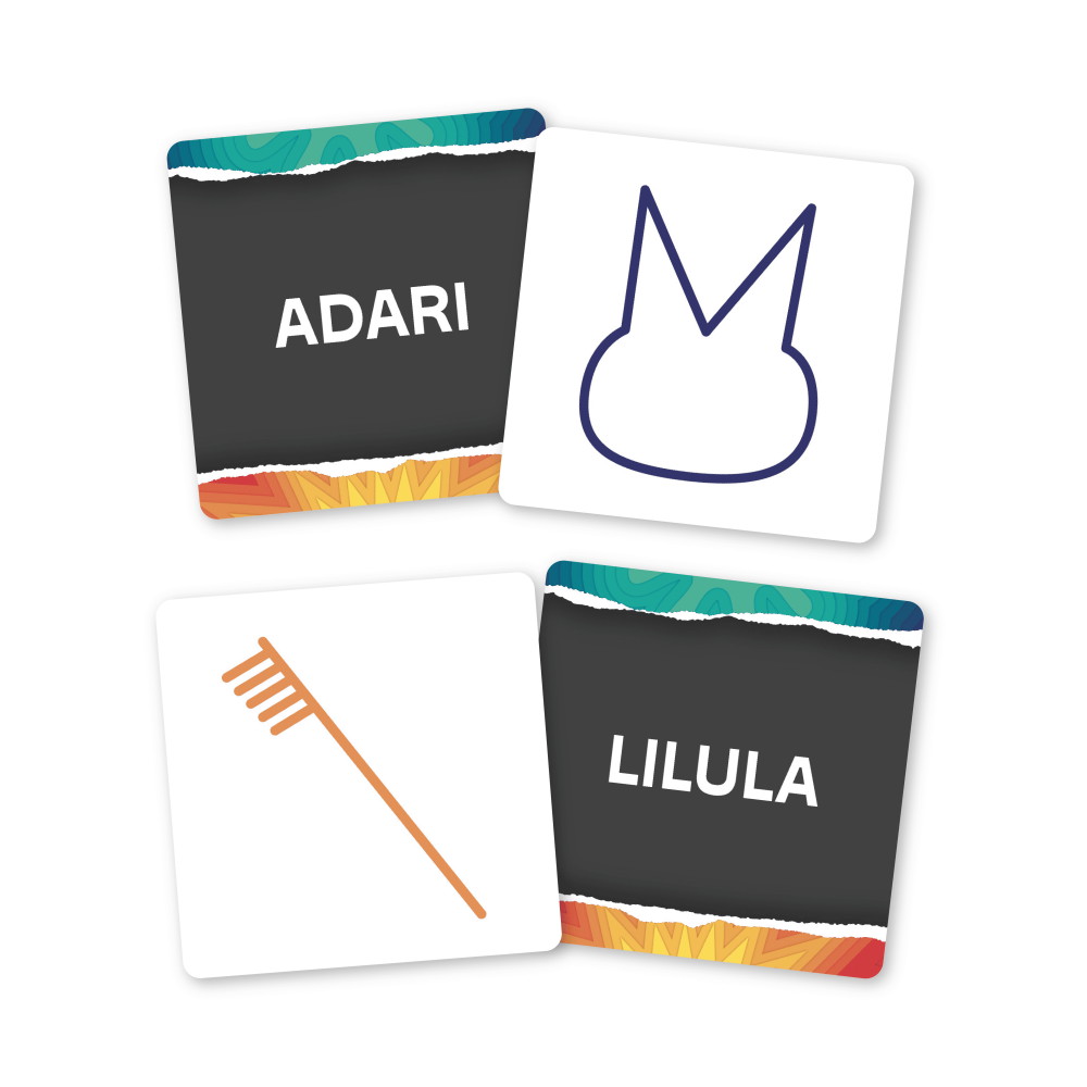 The cards in Bouba/Kiki display a nonsense word on one side, and a simple illustration on the other. In the basic game, you are faced with a set of three of these words and one shape, and must decide which word goes best with the shape. Points are earned by choosing the same target as your teammates.