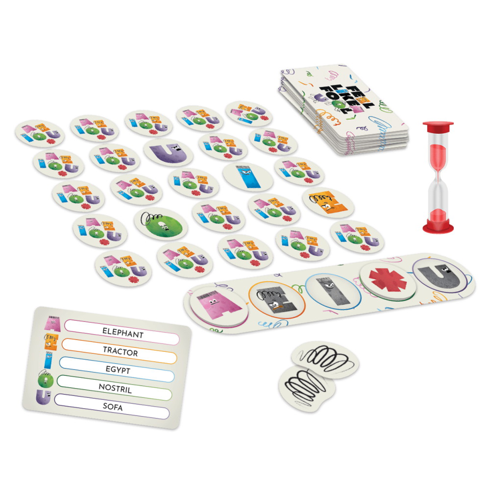 Two teams compete to be faster to fill their boards with all the vowel tokens needed.
