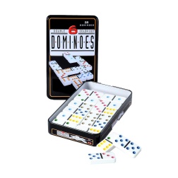 Dominopeli, jossa on 28 muovista valmistettua laattaa ja värikkäät pistemerkinnät. Setti toimitetaan peltirasiassa.
