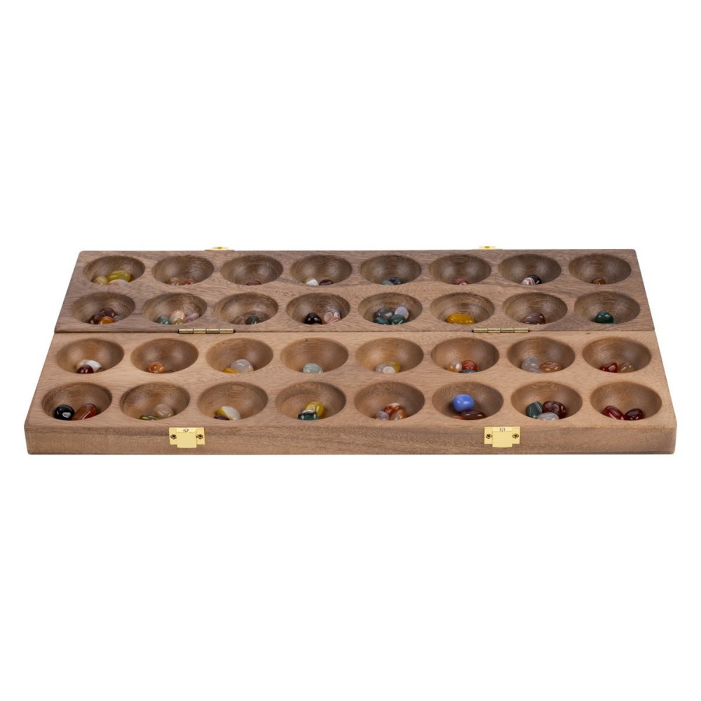 Kalaha on valmistettu saksanpähkinästä. Sisältää 75 jalokiveä, ohjeet ja säilytyspussin.