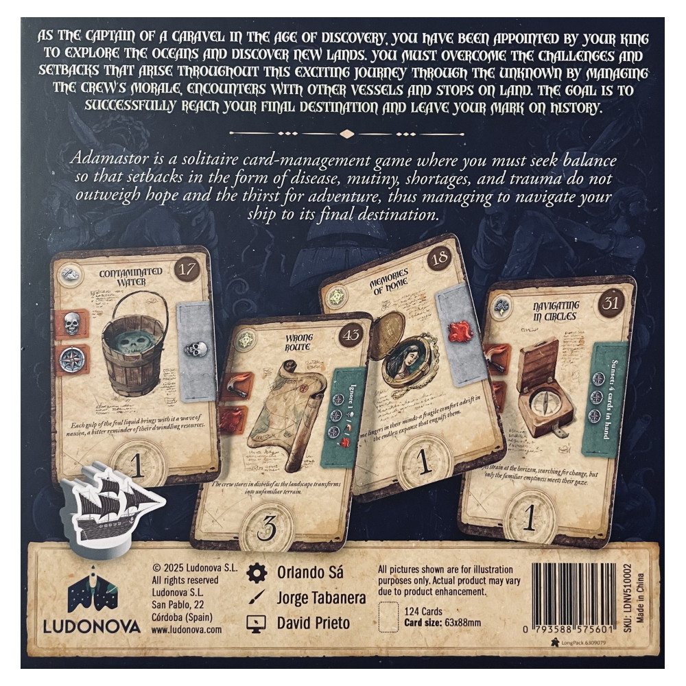 Adamastor on strateginen kortti- ja tableau-peli, jossa korteilla on useita käyttötarkoituksia. Tasapainottelet resurssien, moraalin ja riskien välillä samalla kun tapahtumat laukeavat tekemiesi valintojen perusteella. Myrskyt riehuvat ja paine kasvaa – mutta taitava kapteeni osaa kääntää vaikeudet edukseen.