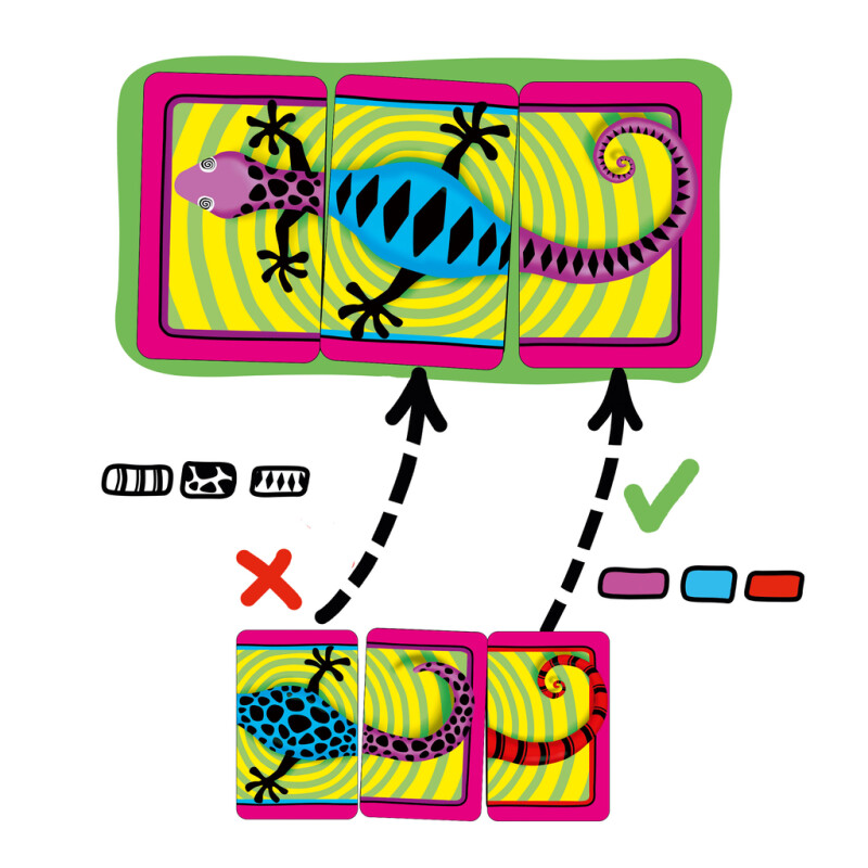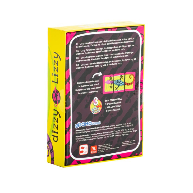 This is a strategic and turn-based competition to be the first to get rid of all your cards! Test your skills in Dizzy Lizzy by matching three body parts, three colors and three patterns. The card game that continues to be fun! The game can be played in 3 different ways. The game lasts about 10 minutes per round.