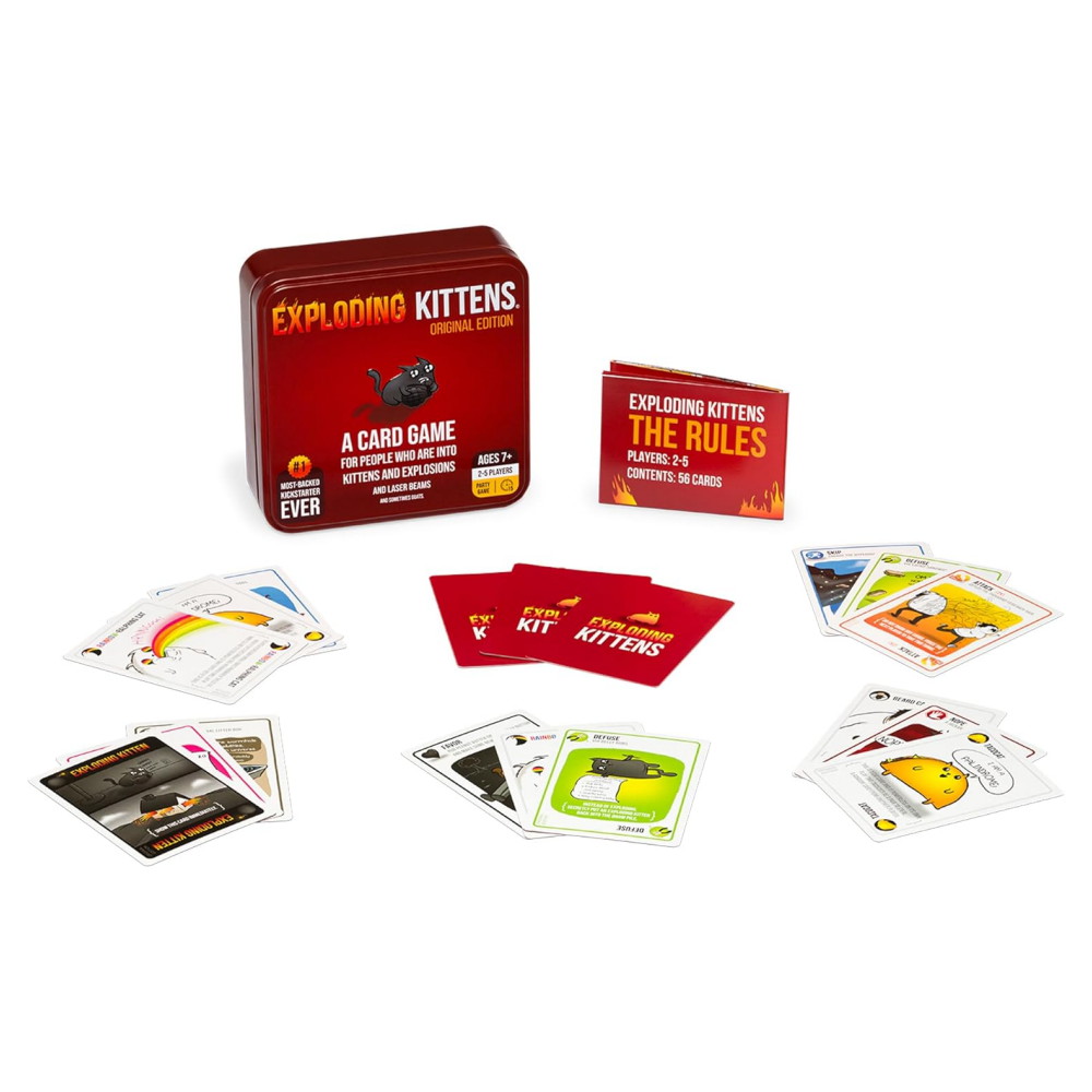 Exploding Kittens teki historiaa tullessaan Kickstarterin eniten tukevaksi peliksi ja kampanjaksi, jolla on eniten tukijoita kautta aikojen. Se on erittäin strateginen, kissoilla voimistetun version Venäläisestä Rulettista. Pelaajat nostavat kortteja, kunnes joku nostaa Exploding Kitten -kortin, jolloin hän räjähtää, kuolee ja putoaa pelistä – ellei hänellä ole Defuse-korttia, joka voi estää kissan räjähdyksen esimerkiksi laserosoittimilla, vatsahieronnalla tai kissanminttuleivillä. Kaikki muut kortit pakassa käytetään liikkumiseen, hallintaan tai räjähtelevien kissojen välttämiseen.