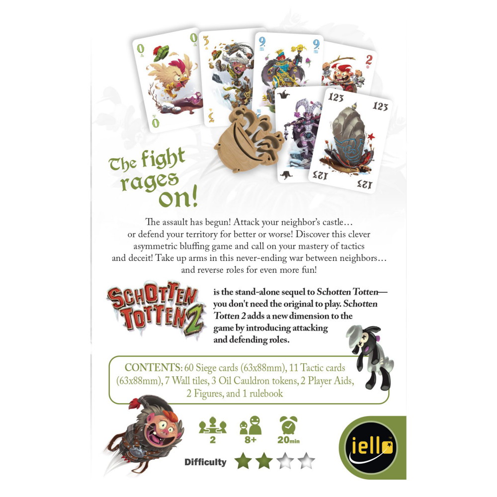 The defender has three boiling oil tokens available to them to clear out the attacker's cards. The deck consists of cards numbered 0-11 in five colors, along with ten tactical cards.