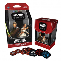 Aggressive Negotiations on valmis 80 kortin Twin Suns -pakka, joka antaa sinulle nopean alun moninpeliseikkailuun. Johtajina toimivat Anakin Skywalker ja Padmé Amidala, yhdistäen aggressiivisen paineen ja taktisen hienovaraisuuden tehokkaaksi kokonaisuudeksi.