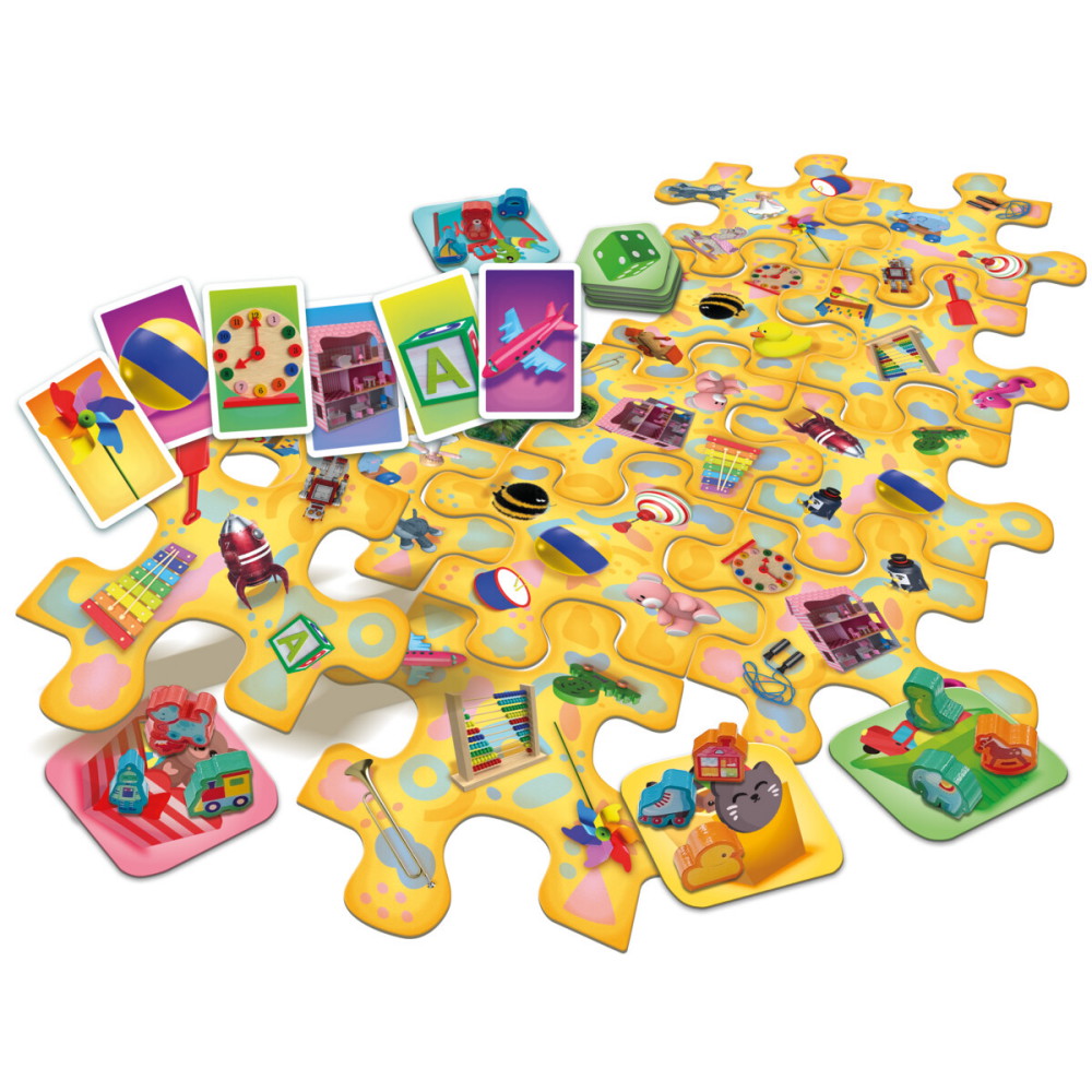 12 pelilautaosaa, 55 korttia, 4 lelulaatikkolautaa, 13 puista lelunappulaa, 5 lisäpelilaattaa, säännöt.