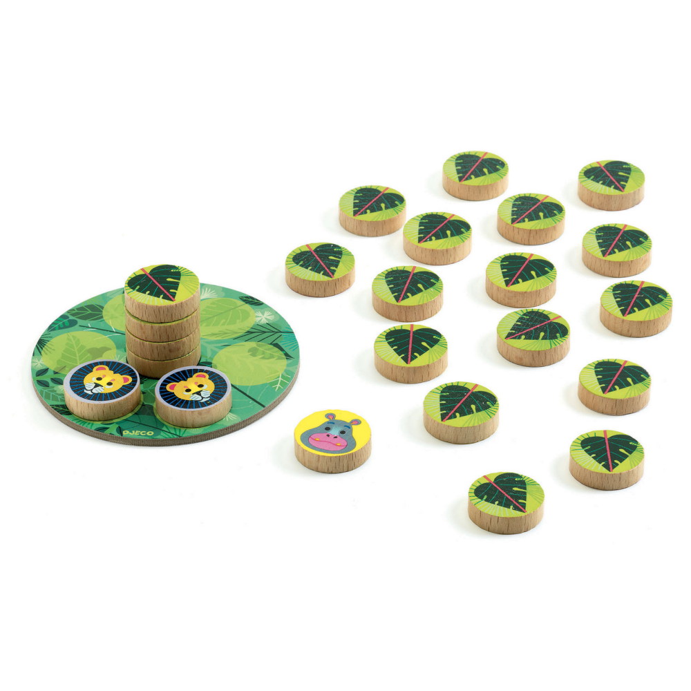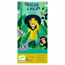 Contents: 1 jungle game board, 10 tiles with zebras, 10 tiles with hippos, 10 tiles with parrots, 6 tiles with Oskar the lion, 1 tile with Max the monkey and a booklet with game rules