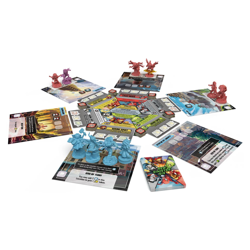 This expansion brings a whole new set of sinister Villains for the Heroes to face. Whether tackled on their own, or as the united New Sinister Six, each of these Villains poses a unique threat. But to bring Maximum Carnage to any of your games, this set also includes the Carnage Challenge, where Dark Carnage prowls around the game area infecting people and raising the stakes of the game. Take him out quickly, or you may find yourself facing Dark Carnage as a full-fledged Villain!