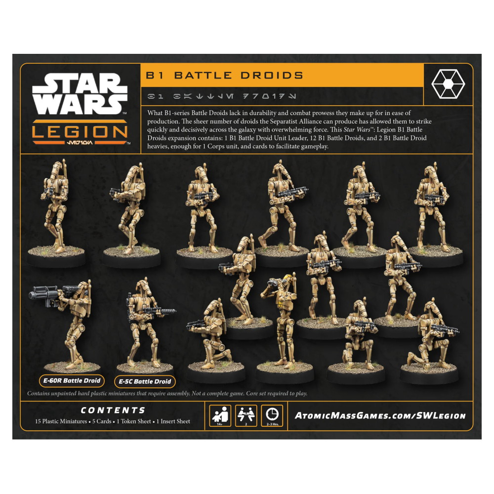 This Star Wars: Legion B1 Battle Droids expansion contains: 1 B1 Battle Droid Unit Leader, 12 B1 Battle Droids, and 2 B1 Battle Droid heavy.