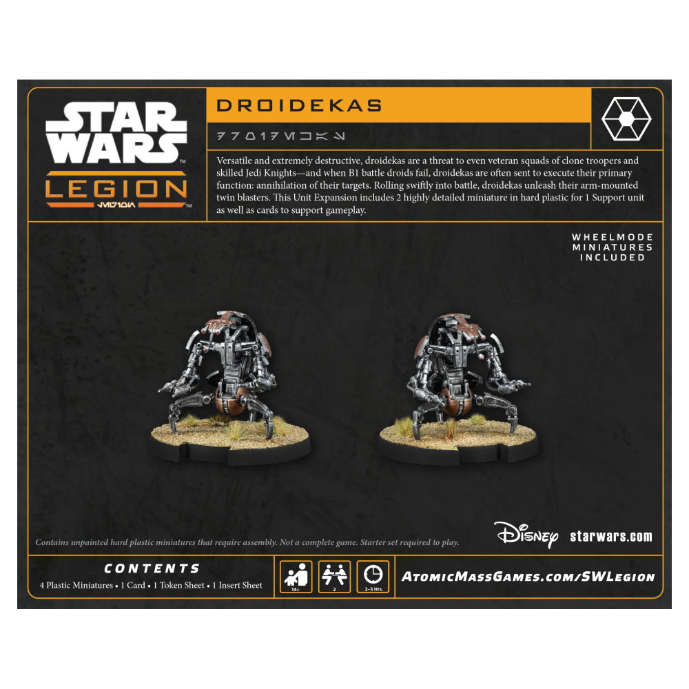 Droidekas-yksikkölaajennuksen avulla voit tukea droidijoukkojasi joillakin galaksin tehokkaimmista taisteludroideista. Neljä hienosti yksityiskohtaista, maalaamatonta Droidekan miniatyyriä, jotka ovat identtisiä Star Wars: Legion Clone Wars Core Setissä olevien miniatyyrien kanssa, esittävät Droidekasi, kun ne kiitävät taistelukentän poikki pyörätilassa ja päästävät tukahduttavan tulen valloilleen hyökkäysasennossaan. Samalla yksikkökortti esittelee täysin Droidekojen kyvyt, ja kolme päivityskorttia antaa sinulle vapauden muokata niitä viestintäjärjestelmillä.