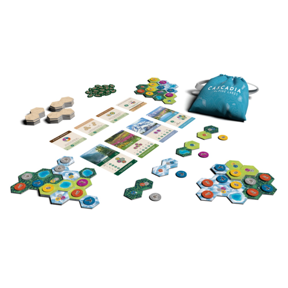 Cascadia: Alpine Lakes tuo uusia ulottuvuuksia tuttuun pelimekaniikkaan. Asetat kaksoisheksalaattoja ja pinoat niitä luodaksesi kolmiulotteisen ympäristön. Eläinten sijoittelu, korkeuserot ja ympäristön rakenne vaikuttavat pisteytykseen.
