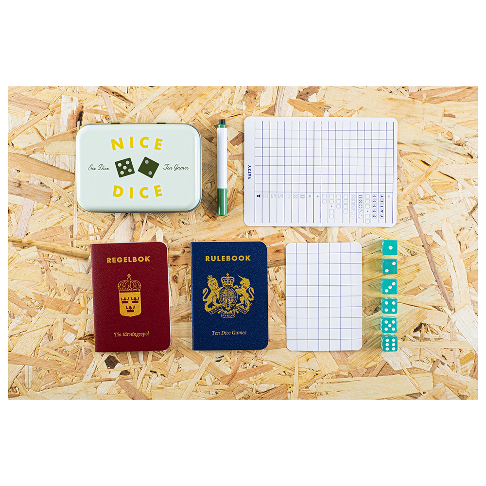 Sisältää sääntökirjan ruotsiksi ja englanniksi peleihin 10 000, Balut, Cubilete, Drop Dead, Sika, Help Your Neighbour, Knock-Out, Ship, Captain & Crew, Yatzy ja Maxi-Yatzy.