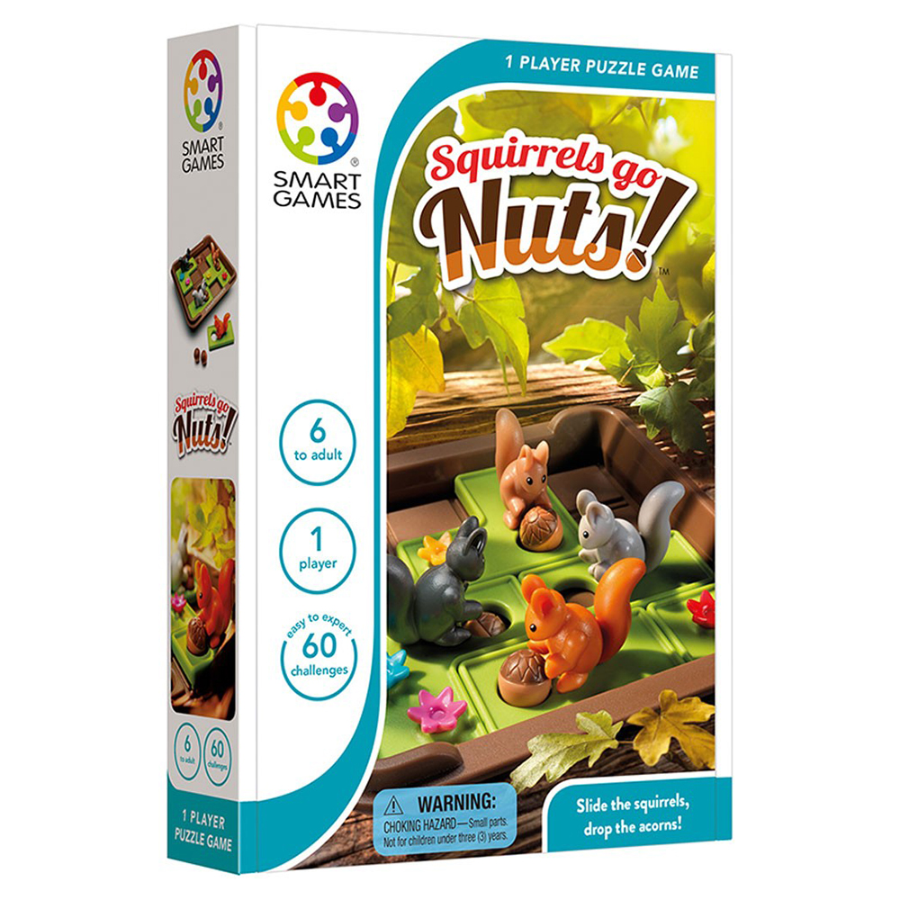 Älä pudota pähkinöitä liian aikaisin väärään koloon! Joissakin haasteissa oravien tulee pudottaa pähkinät koloihin juuri tietyssä järjestyksessä. SmartGames Squirrels Go Nuts -pelissä riittää haastetta koko perheelle! Voit ratkaista haasteita yksin tai yhdessä kaverin kanssa.