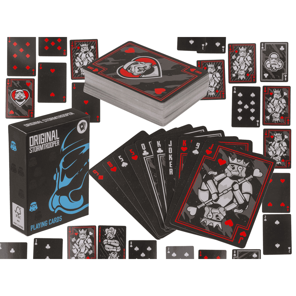 Tässä pakassa on tyylikäs Stormtrooper-teema, jossa yhdistyvät klassiset pelikortit ja avaruussotilaiden innoittamat ikoniset motiivit.