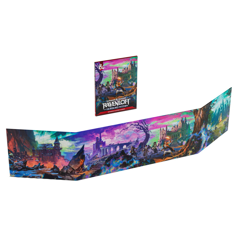 Dungeons & Dragons: Ravenloft – The Horrors Within Dungeon Master’s Screen on täydellinen apuväline tunnelmalliseen pelaamiseen. Kaksipuolinen näyttö sisältää goottilaista taidetta ja hyödyllisiä taulukoita, jotka pitävät tärkeät säännöt helposti saatavilla.