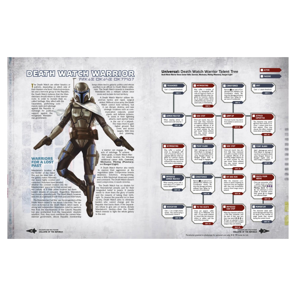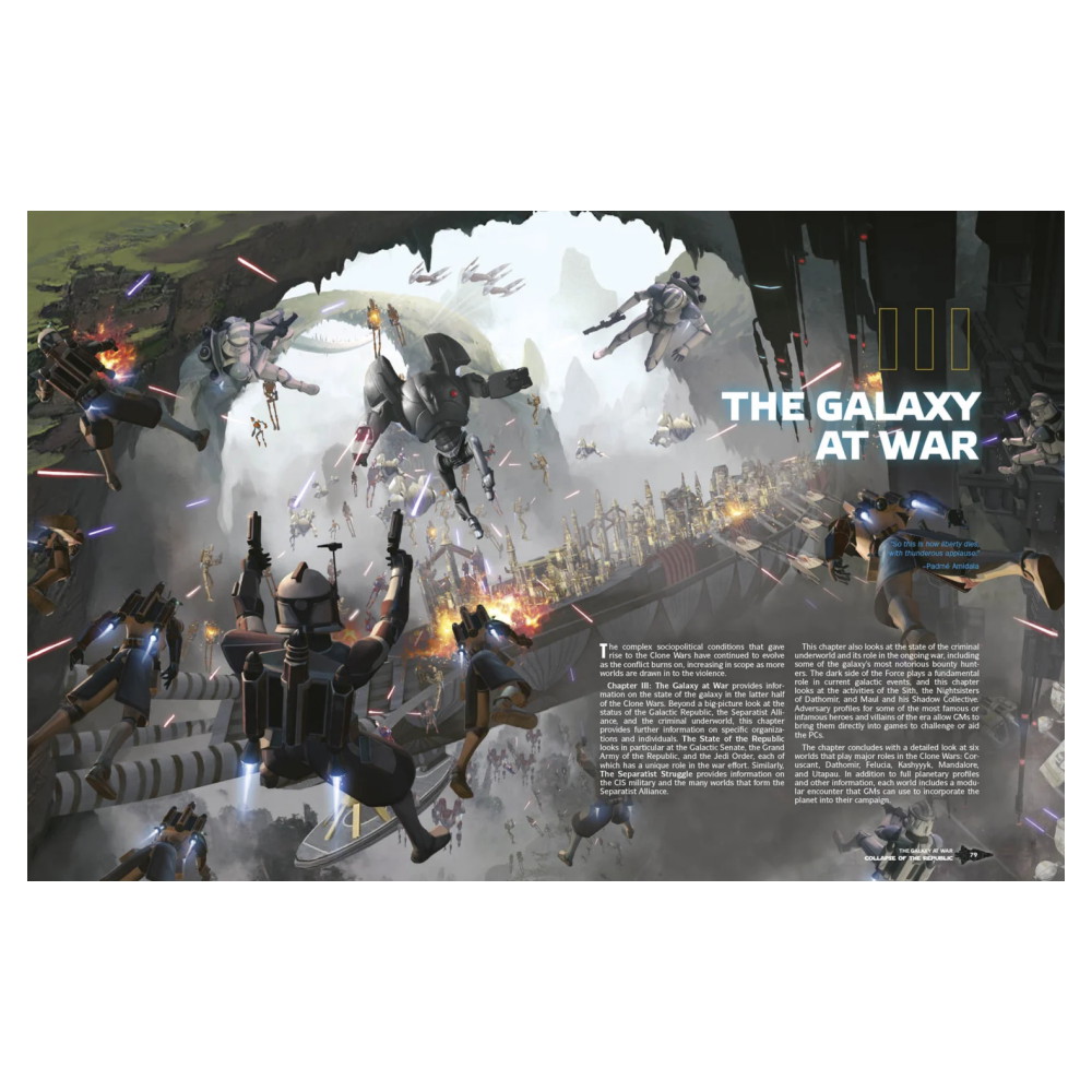 Pelaajille tarjoutuu uusia hahmovaihtoehtoja, kuten Death Watch -soturi ja salaperäinen Nightsister. Pelinjohtajille kirja tarjoaa runsaasti työkaluja: ikonisten NPC-hahmojen kuvaukset, aikakauteen sopivat planeettaoppaat sekä kampanjasisältöä, joka seuraa tapahtumia aina Order 66:een ja Klonkrigien loppuun asti. Täydellinen lisä kaikille, jotka haluavat kokea galaksin historian käännekohdan.