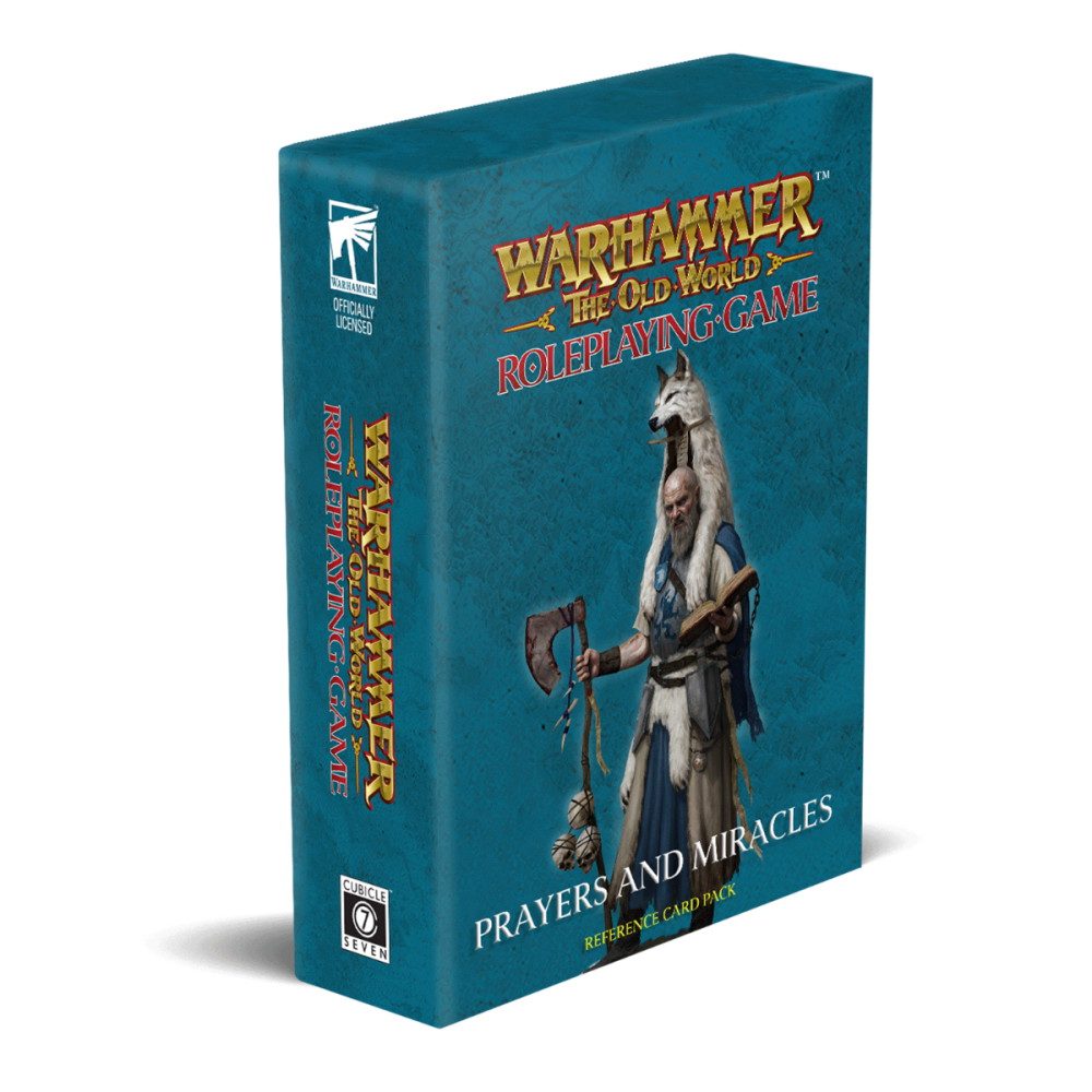 Warhammer: The Old World RPG – Prayers & Miracles Card Deck sisältää kortteja, jotka kuvaavat rukouksia, siunauksia ja ihmeitä useilta jumalilta, kuten Sigmarilta, Ulricilta ja Taalilta. Kortit tekevät jumalallisten voimien käytöstä helppoa ja nopeaa pelin aikana.