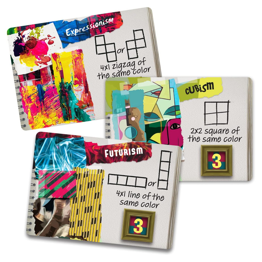 At the start of the game, you lay out scoring cards for each round, so you all know what you're trying to achieve to score. Additionally, at the start of each round, each player receives an inspiration card that shows a pattern they're trying to create on the canvas.