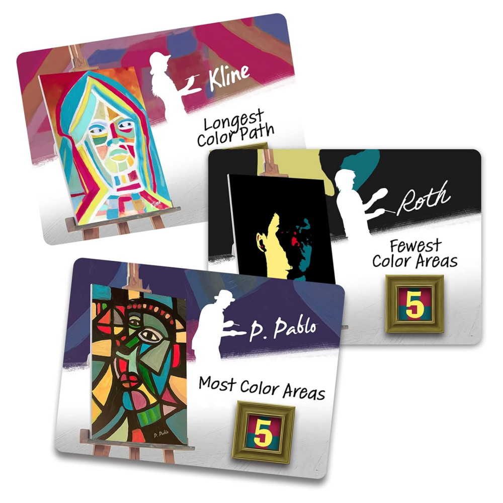 Once the canvas is filled, the two rows closest to you form your scoring zone. If the color patterns in your zone complete a scoring card better than the patterns in anyone else's zone, then you claim the scoring card. Additionally, if you've created the right pattern in your scoring zone, you can score your inspiration card. Whoever has the most points after three rounds is the star pupil of Abstract Academy and wins!