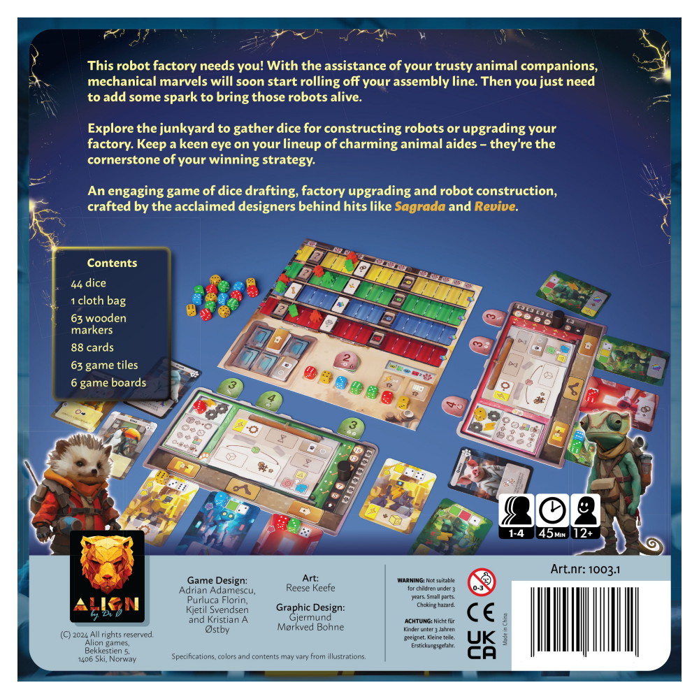 Players can also use spark to activate the abilities of their completed robots, or use cogs to recruit their animal assistants. You start the game with six assistants, each with a unique ability, and you should shape your strategy around them. The variety of assistants ensures that each game provides a different challenge. In the advanced game, players draft the assistants, providing more strategic options.