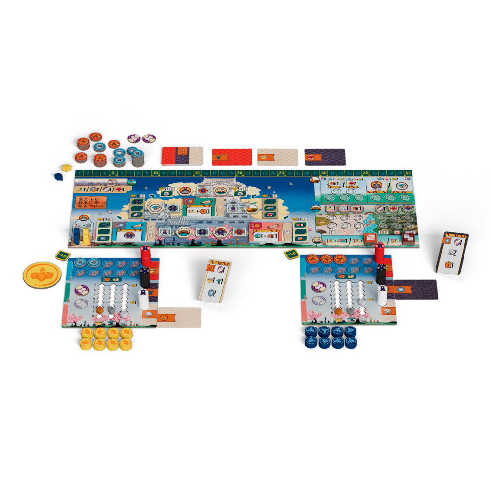 Two clans compete to exert their influence in the White Heron's court, managing resources and building engines. Use lamp tokens to obtain resources and activate actions. Among the actions available, you can buy and upgrade influence cards, place clan seals on gardens and training grounds, move your courtier between circles of influence, or trade with the Portuguese. These actions will allow you to accumulate a series of icons - flags, katanas, kabutos, and origami figures - that will reward you with points, and whoever ends up with the most points wins.