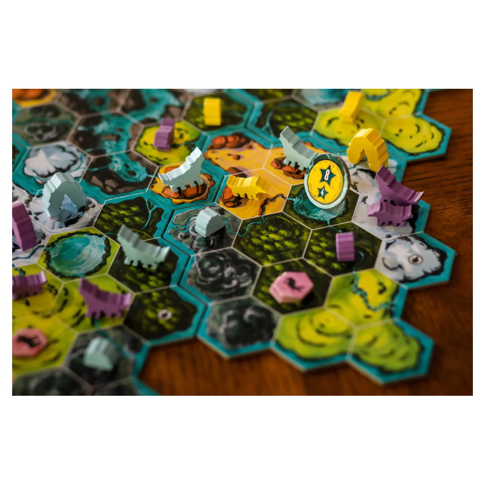 A clever action-selection mechanism drives your choices. Each action requires you to flip terrain tiles matching the terrain where you wish to take your action. These double-sided tiles mean the actions you take this round will set up which terrain types you can act on in the next round. As you take actions to expand your pack’s control of each region, you will also upgrade your pack’s attributes, allowing you to take more aggressive actions as the game goes on.
