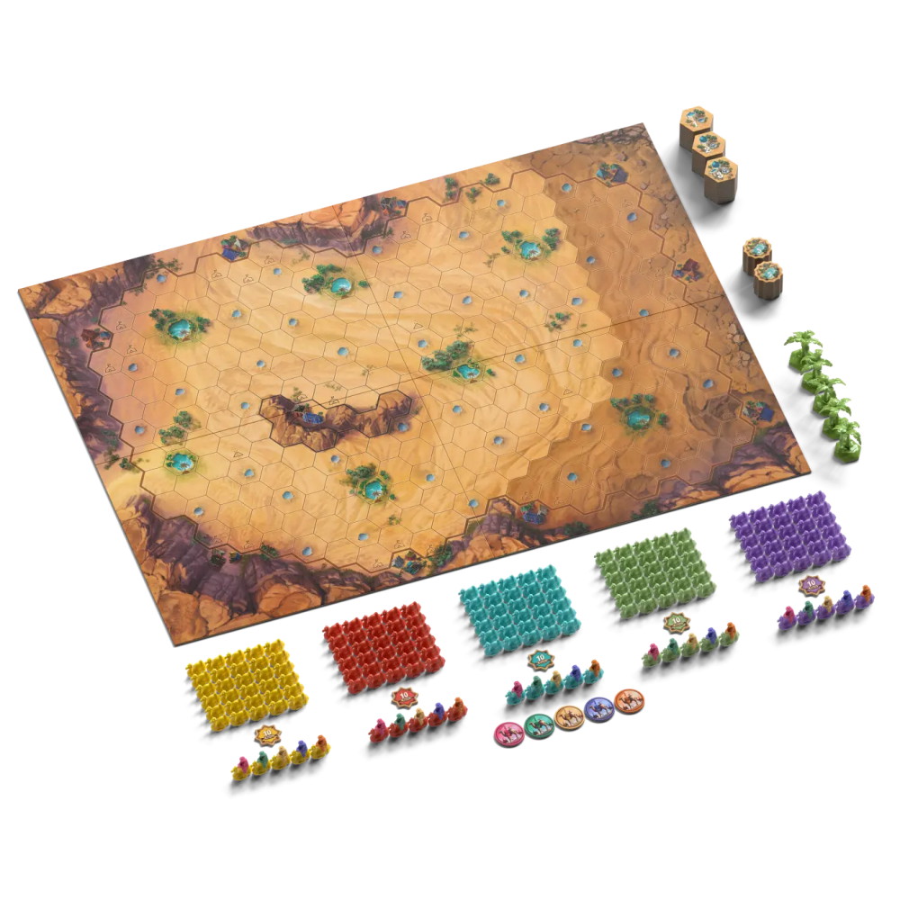 Strategy is essential in deciding how and where to build your tribe's caravans. There are multiple ways to gain points and several ways to win. Should you try to build the longest caravan? Or should you dominate the desert's oases? Don't forget to keep an eye on your opponents' caravans, or you may find your own tribe cut off from valuable water holes.