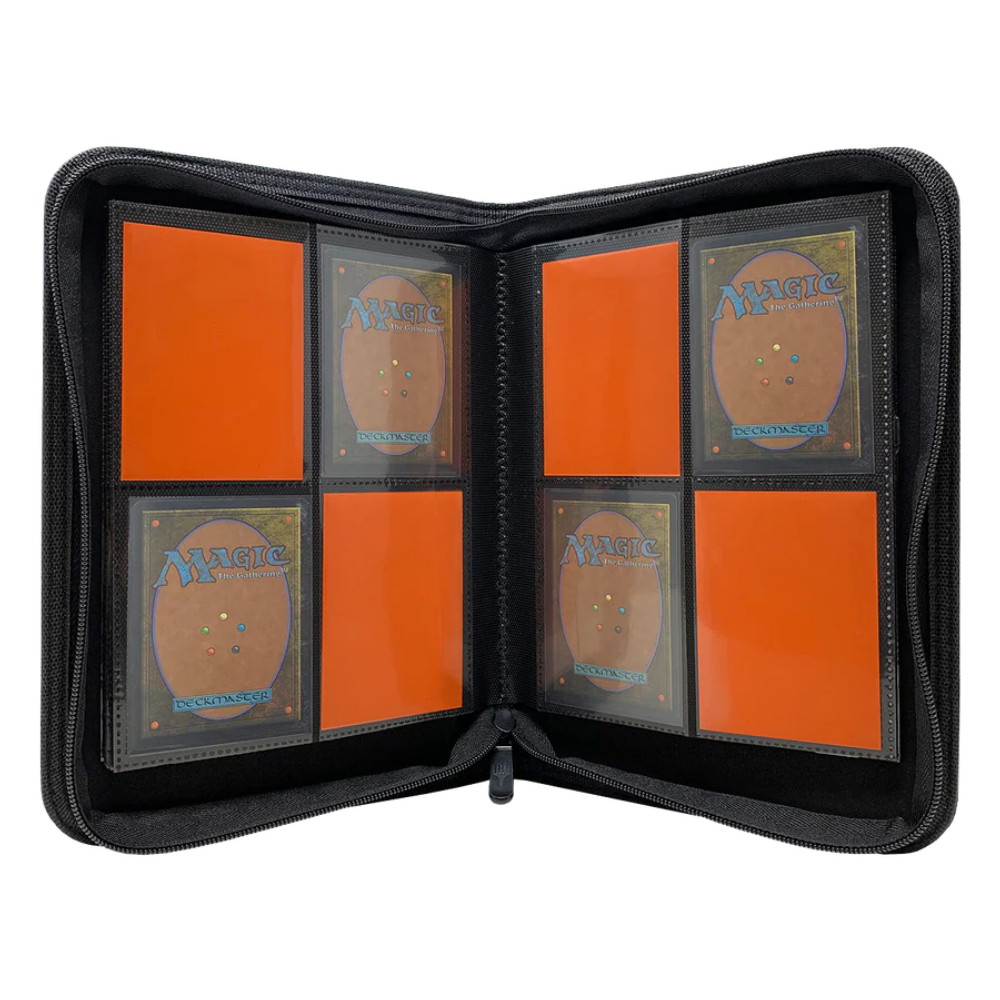 Magic: The Gathering – 4-Pocket Zippered Pro Binder Mythic Edition tarjoaa turvallisen säilytyksen sideload-taskujen ja vetoketjun ansiosta. Kortit pysyvät paikoillaan, ja musta tausta tuo ne tyylikkäästi esiin.