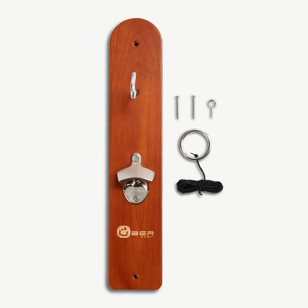 • 1 x hardwood backboard with bottle opener and magnetic bottle cap catcher, comes with pre-drilled holes for the mounting screws